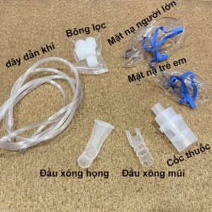 Trọn bộ sản phẩm bao gồm: Máy xông, bông lọc, dây dẫn khí, cốc thuốc, 1 mặt nạ cho người lớn và 1 mặt nạ trẻ em, đầu ngậm miệng xông họng, đầu xông mũi